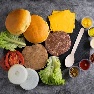 2 Uncooked patties, 2 potato bun, fresh lettuce & tomato slices, cheddar cheese, 2 special sauce, 1 fried onion