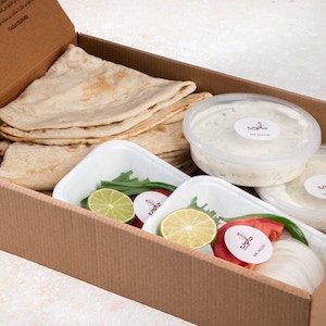 2 Hommus, 1 Salad, 1 Pickles, 5 breads