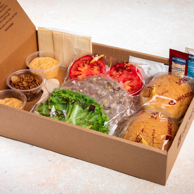 2 Uncooked patties, 2 potato bun, fresh lettuce & tomato slices, cheddar cheese, 2 special sauce, 1 fried onion
